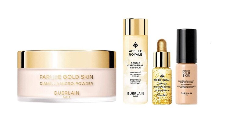 这组保证超持妆!由24K 纯金光透丝绒蜜粉搭配金光瓶及24K纯金保湿持妆凝露让妆容牢牢贴肤外,皇家蜂王乳蜜露更能于保养步骤有效润泽滋养肌肤、增加持妆度,想打造完美底妆这组是绝对必收!